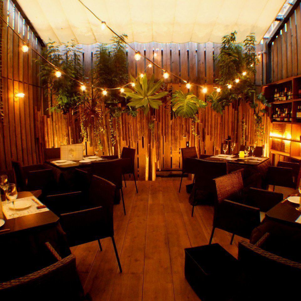 【1F】カウンターを抜けると晴れの日には夜空も望むデッキフロア。最大30名規模の宴会にもご利用可能。歓送迎会や各種宴会、ウエディング2次会などの貸切にも対応できます。