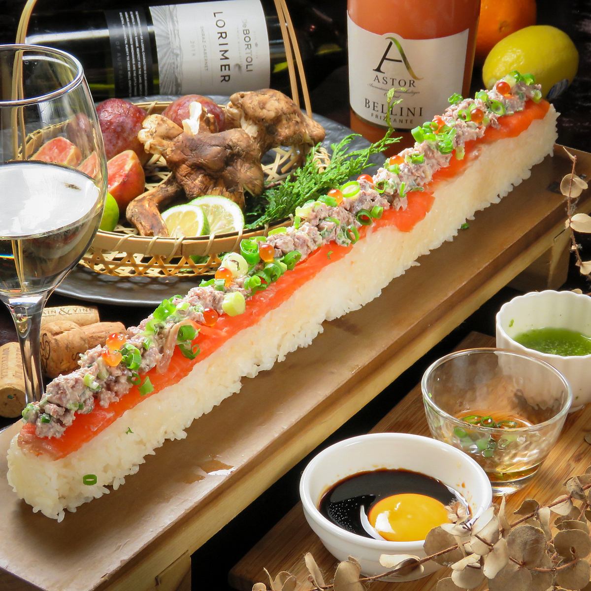 刺身、肉、Sushi…etc. ワインと相性のいい創作料理をご提供。和の寿司に洋の要素を取り入れたコース各種には、お好みワイン、ドリンクと一緒にお愉しみ下さい。各種シーンでご利用頂けるよう、単品飲み放題も1200円からご用意♪
